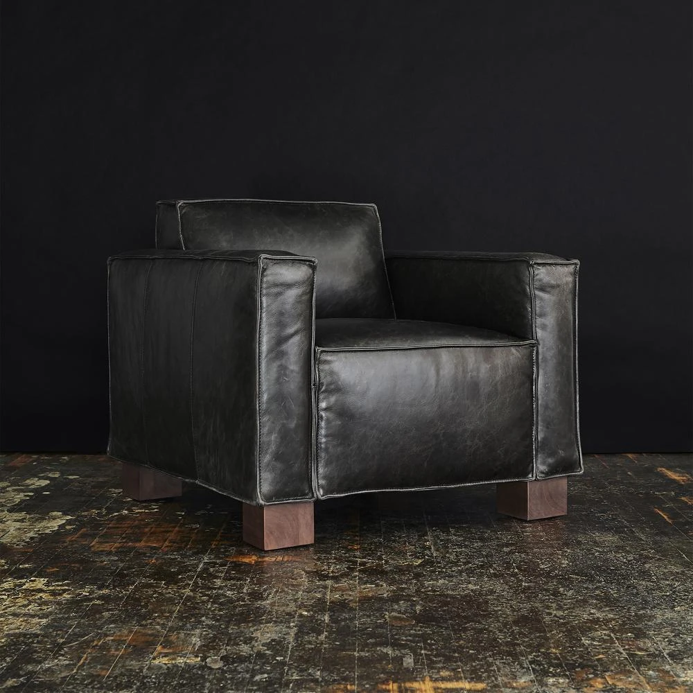 The Cabot Chair features a tight seat and back, with architectural, wood block feet and simple French seams, offering a comfortable, modern take on a traditional, masculine design. Available in three vintage leathers chosen for their unique grain characteristics that will age beautifully and develop a rich, natural patina over time. Also available as a sofa. Our leather hides are carefully selected for their raw, natural surface characteristics which make each piece unique.