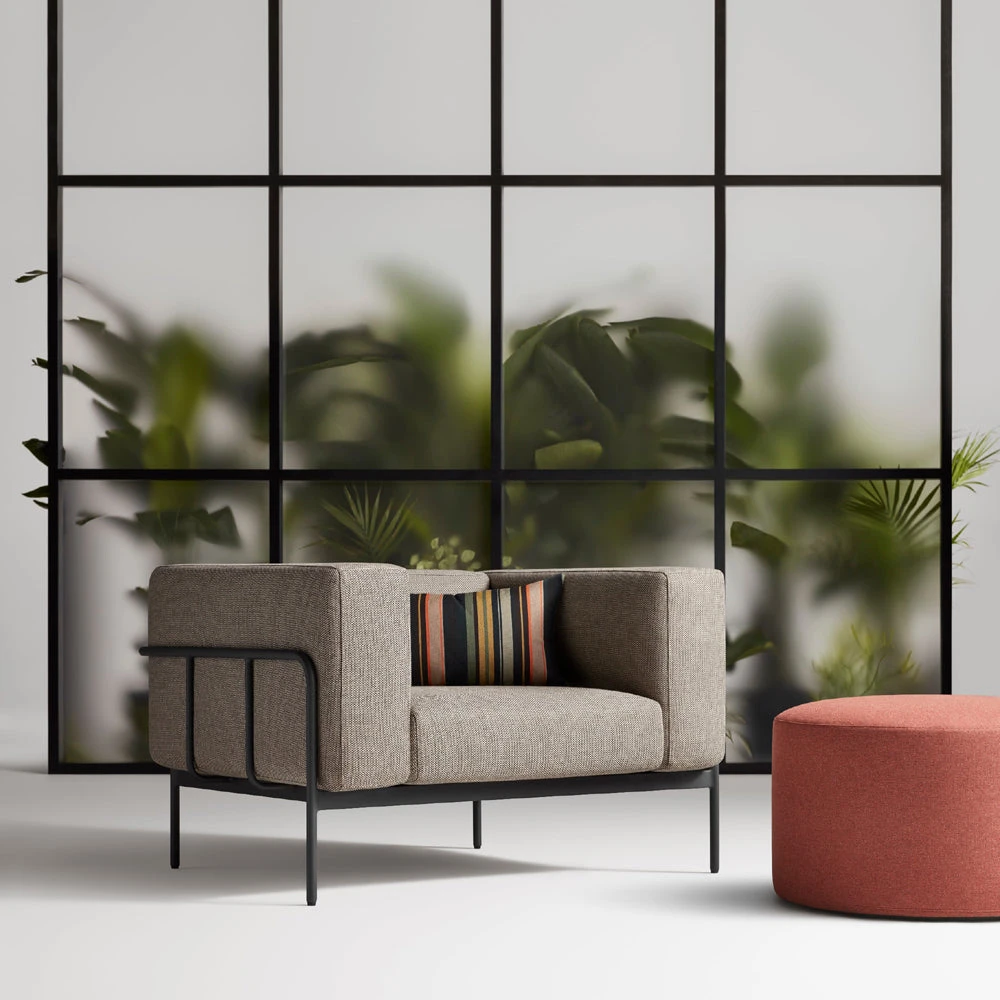 Designed to withstand the elements, Cache is well-dressed enough to hold its own with the indoor crowd too. A tubular painted aluminum frame gently bends to cradle comfy inset cushions upholstered in high-performance Sunbrellaâ„¢ fabric. Perfect for highly sunlight spaces and active audiences, place Cache in or out.