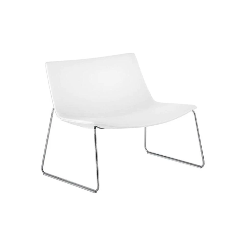Lounge chair with sled base in chromed steel and polyurethane shell upholstered in leather, faux leather, fabric or customer’s fabric.