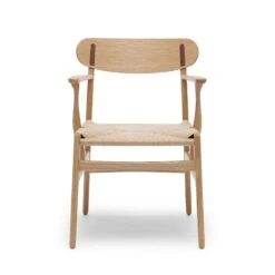 The CH26 dining chair is closely related to the CH22 lounge chair. Both have good ergonomics, a sturdy construction and characteristic curved armrest supports. CH26 serves as both a dining chair and desk chair, and Wegner has taken the table height and chair usage carefully into account in its proportions and construction.