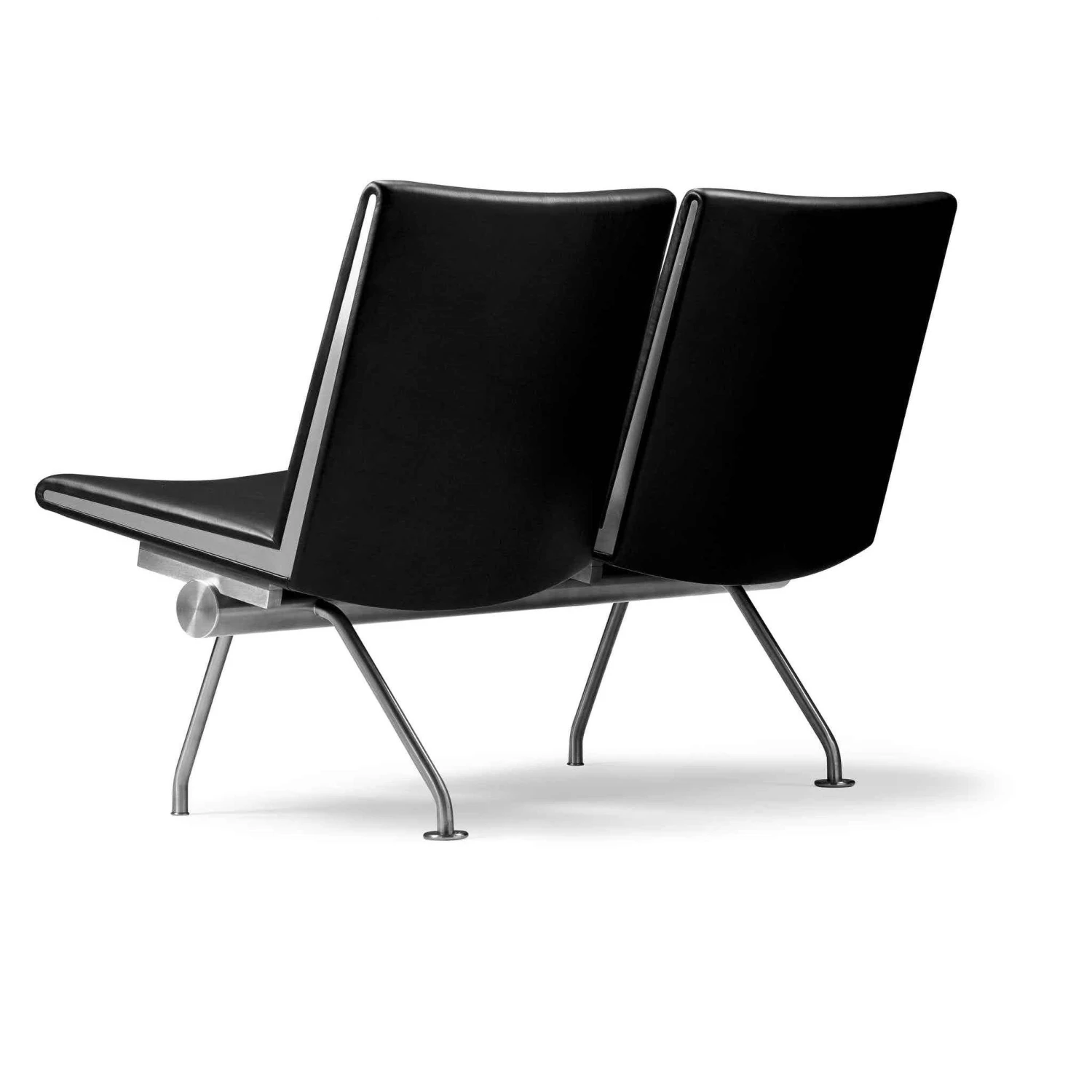 The CH402 two-seater sofa by Hans J. Wegner sets an inviting and relaxed tone in public spaces. The sofa has a minimalist design that combines stainless steel and leather or fabric to create a clean and balanced expression.