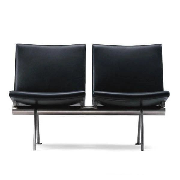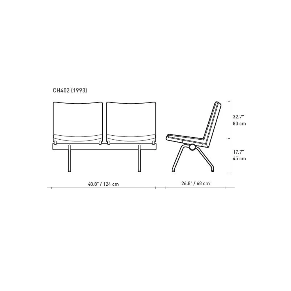 The CH402 sofa from 1990 by Hans J. Wegner has a modern design that is both minimalist and comfortable. The construction cleverly conceals the mechanisms by which the upholstered fabric is attached to the frame with a slender element of stainless steel, thus creating an original design feature out of a functional necessity. The CH402 sofaโs visionary and simple design and solid wood interior frame are crafted for durability. The sofa is still in use at Copenhagen Airport to this day and is part of the wider Kastrup Series, which also includes a lounge chair and two larger sofa options. All models in the Kastrup Series are available upholstered in fabric or leather and are completed with a characteristic stainless-steel angled cover plate on each side.