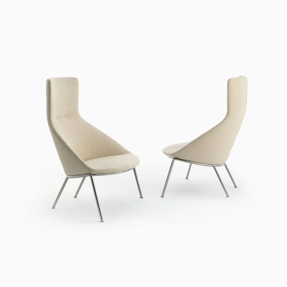 Circa’s highback version features a geometric headrest for additional upper back support to augment its enveloping contours. Providing impressive comfort within a small footprint, the lounge chair has highly responsive ergonomics, with a webbing inner seat that is wrapped in quality foam cushioning. Made in Italy, the chair’s distinctive silhouette and waterfall seat offer a choice of select upholstery options, complemented by the angled metal base in plated, brushed or powder-coated finishes. Â