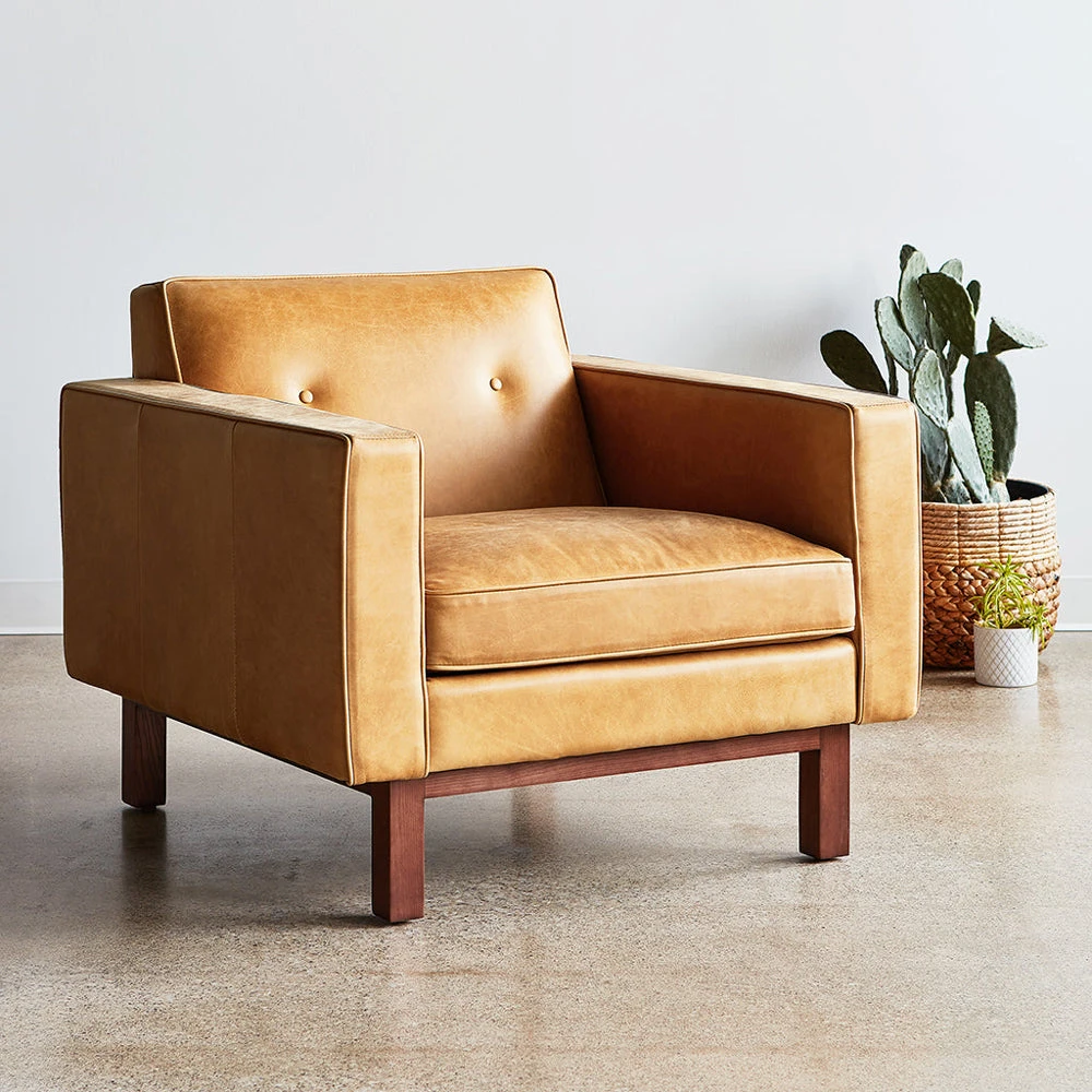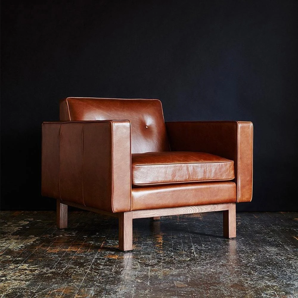 The Embassy Chair conveys a classic, mid-century style with tailored proportions and refined details. It features a button-tufted, tight back design with piping details throughout, and seat cushions filled with a luxurious feather blend. The frame is supported by a recessed, solid-wood base. Available in three vintage leathers, chosen for their unique grain characteristics that will age beautifully and develop a rich, natural patina over time. Also available as a sofa. Our leather hides are carefully selected for their raw, natural surface characteristics which make each piece unique.