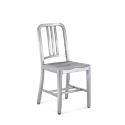 The Emeco navy chairs feature recycled aluminum in a brushed or hand-polished finish. The brushed version is suitable for outdoor use while the polished finish is only recommended for protected outdoor environments. The chairs come standard with soft plastic (TPU) glides but can also be specified with other options. Optional seat pads can be specified in Maharam Ledger vinyl or recycled PET felt post-consumer recycled content and a non-slip backing.