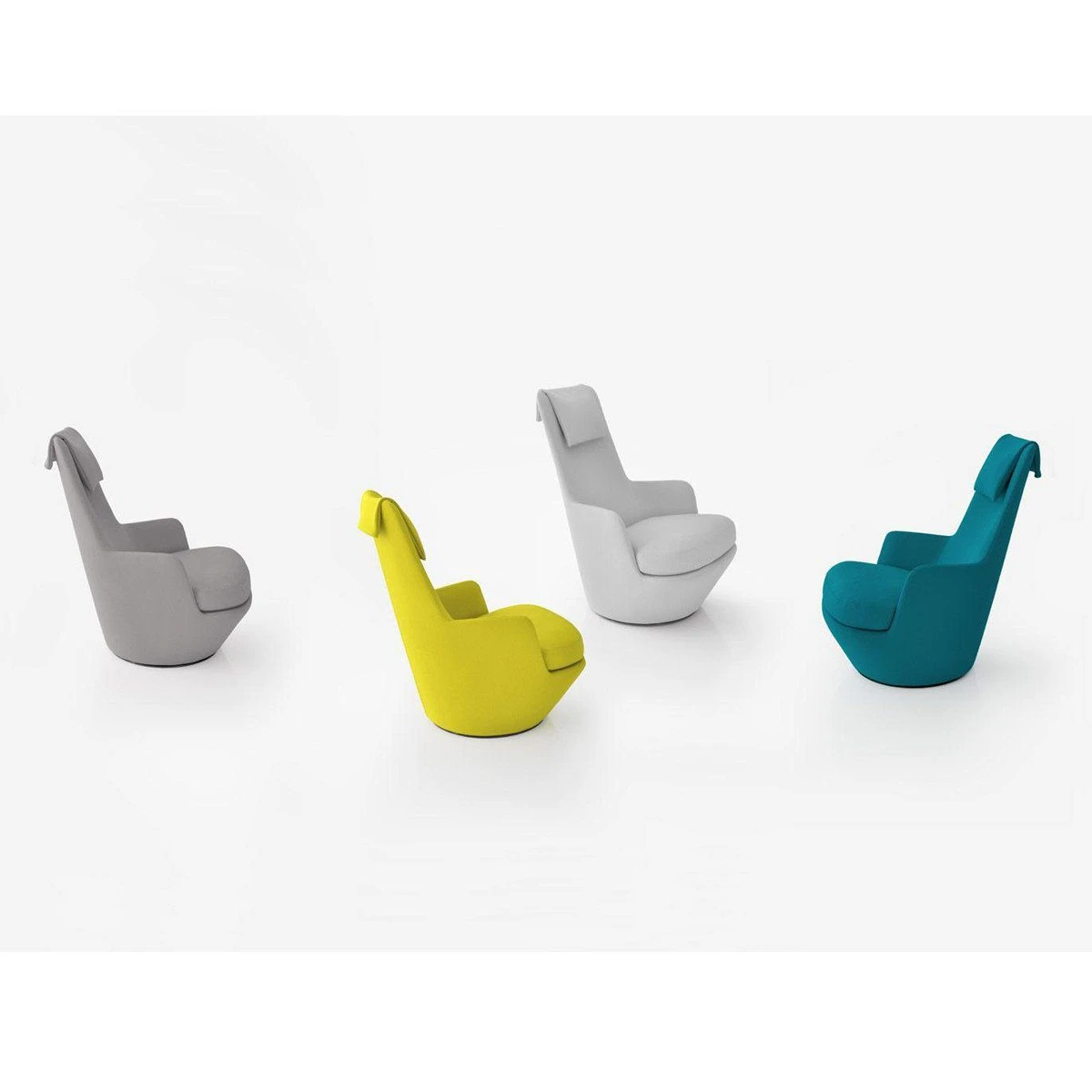 Inspired by the U Turn lounge chair, the Hi Turn is a high-back swivel lounge chair with a discrete circular metal base that rotates smoothly through 360º. The combination of an internal steel frame, injection molded cold foam and a soft down seat make for an inviting and comfortable chair with a tailored appearance. All fabric covers are attached by Velcro and are removable for easy cleaning or replacement.