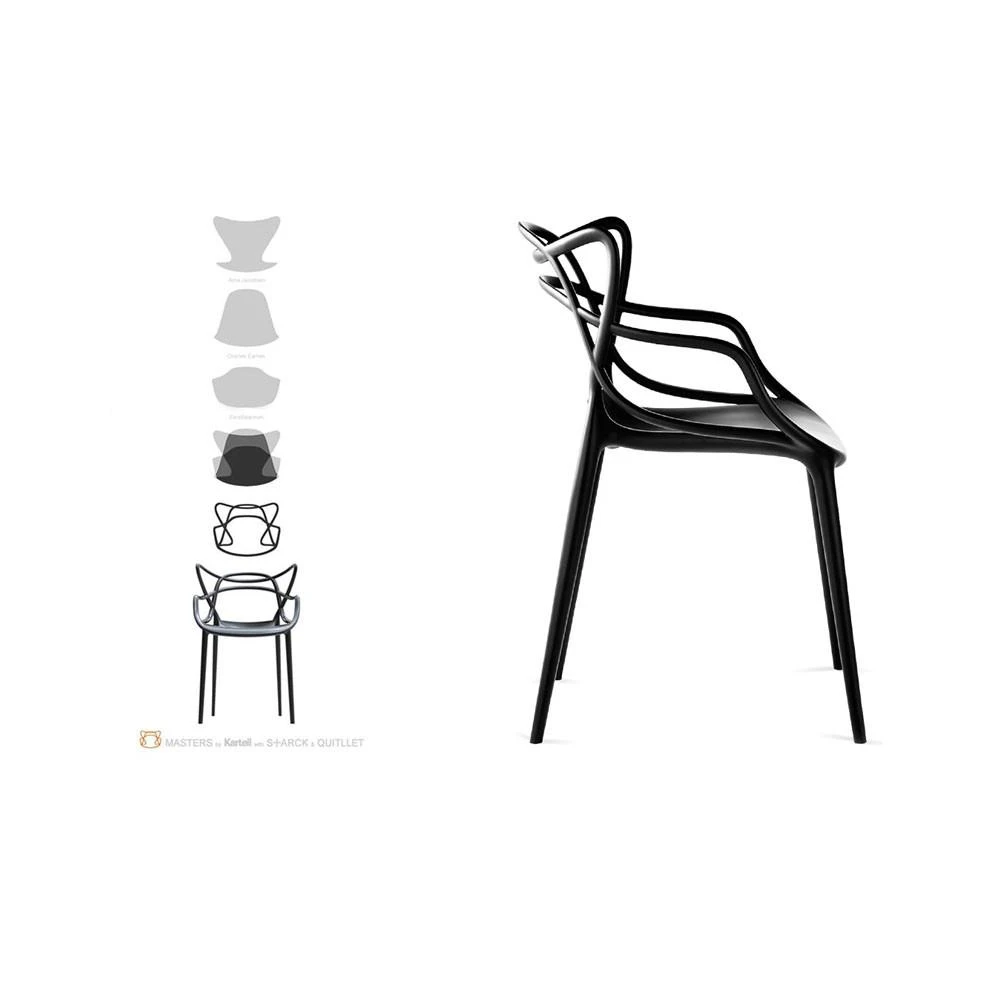On its four slim legs, the Masters seat is roomy and comfy. The back of the chair is its most fascinating feature, of course, characterised by the fullnesses and empty spaces created by the curvaceous criss-crossing lines of three different backs descending to meet together at the seat.