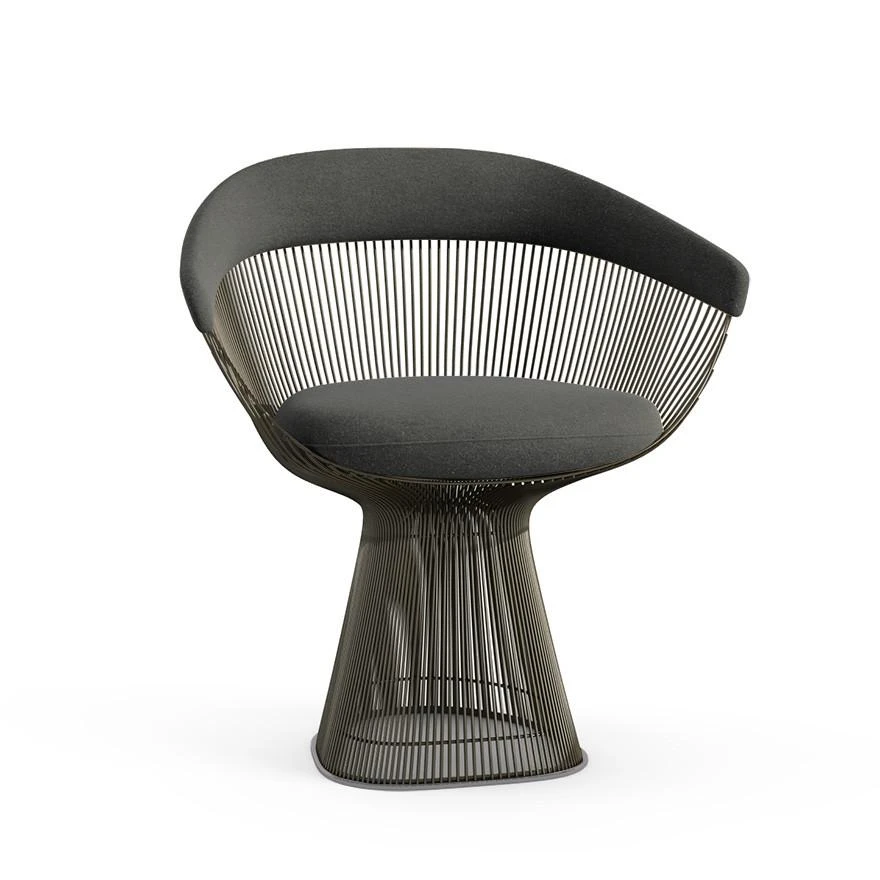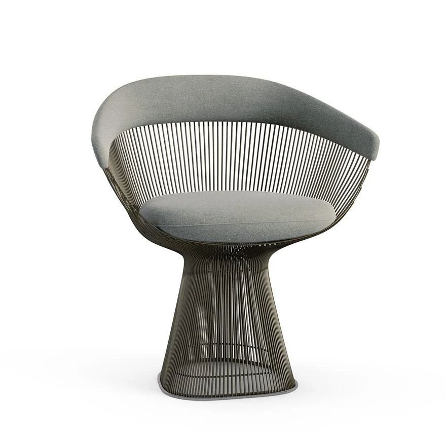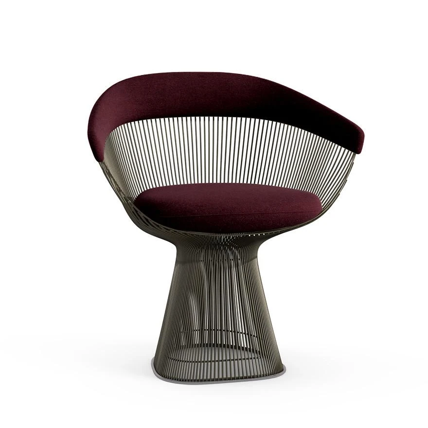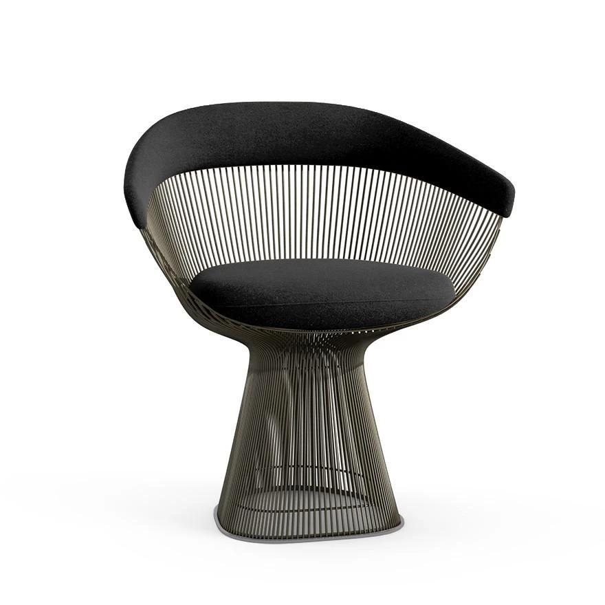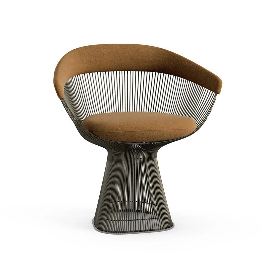 In the 1960s, Warren Platner transformed steel wire into a sculptural furniture collection, creating what is now considered a design icon of the modern era. The furniture’s unique, harmonious forms are produced by welding curved vertical steel wire rods to circular frames, producing a moiré effect and capturing the decorative, gentle and graceful quality that Platner sought to achieve. Metal components are available in two finishes: polished nickel or metallic bronze with a clear protective coating. The seating collection includes a side chair and a lounge chair with complementary stool.