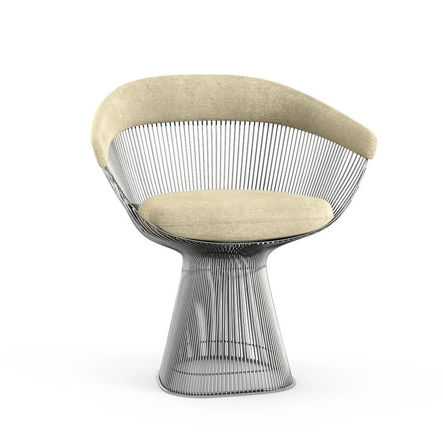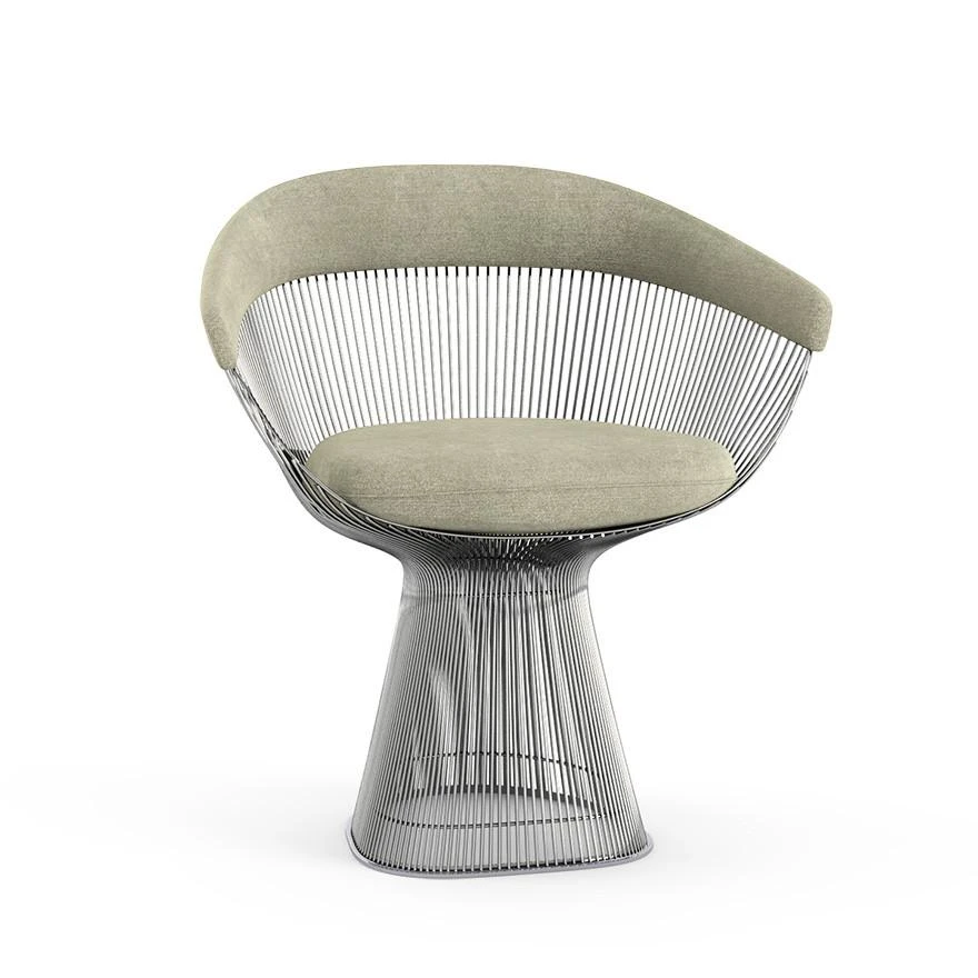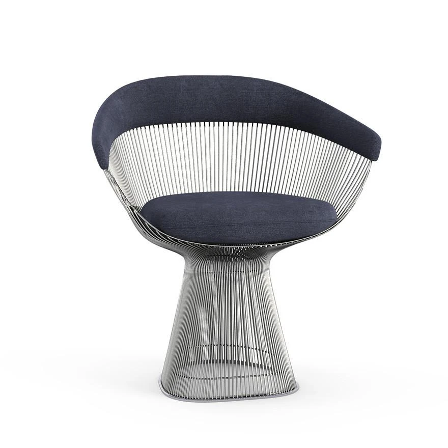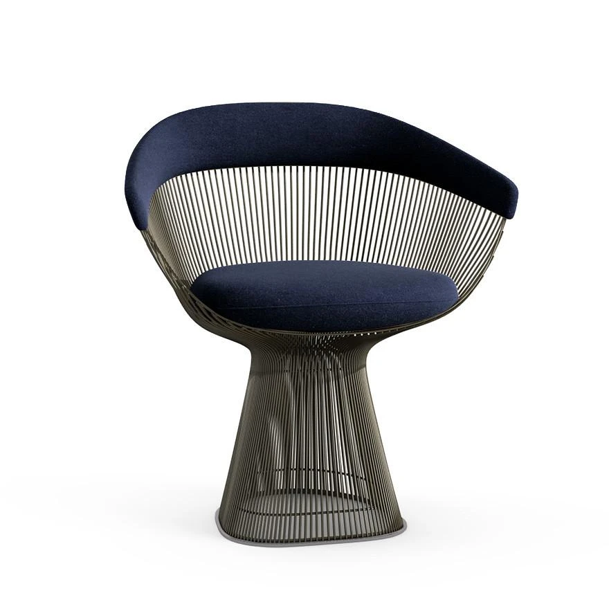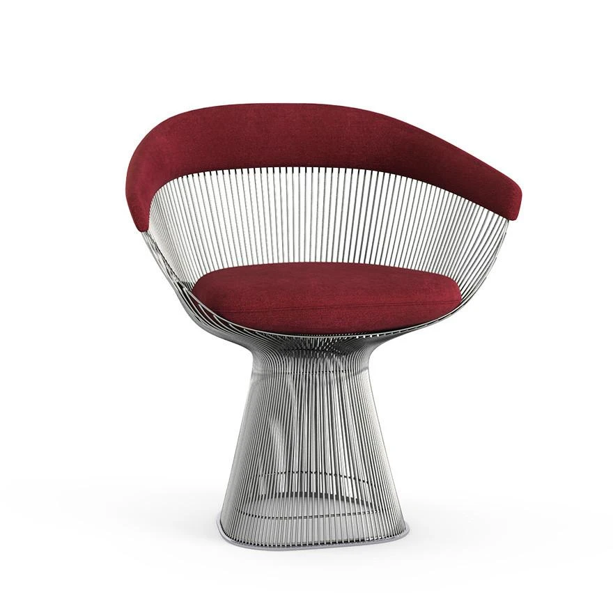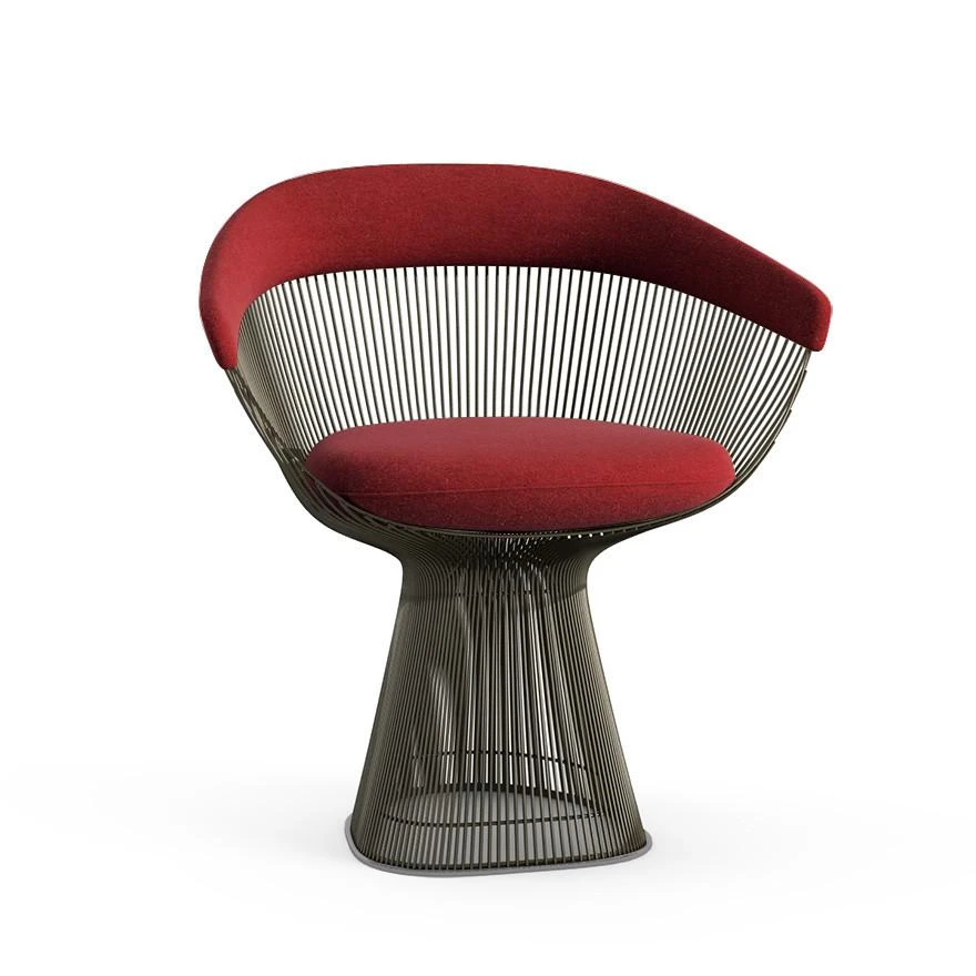 In the 1960s, Warren Platner transformed steel wire into a sculptural furniture collection, creating what is now considered a design icon of the modern era. The furniture’s unique, harmonious forms are produced by welding curved vertical steel wire rods to circular frames, producing a moiré effect and capturing the decorative, gentle and graceful quality that Platner sought to achieve. Metal components are available in two finishes: polished nickel or metallic bronze with a clear protective coating. The seating collection includes a side chair and a lounge chair with complementary stool.