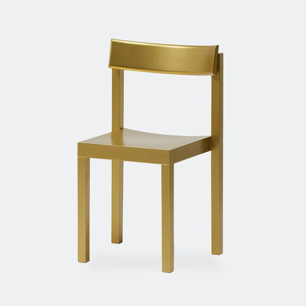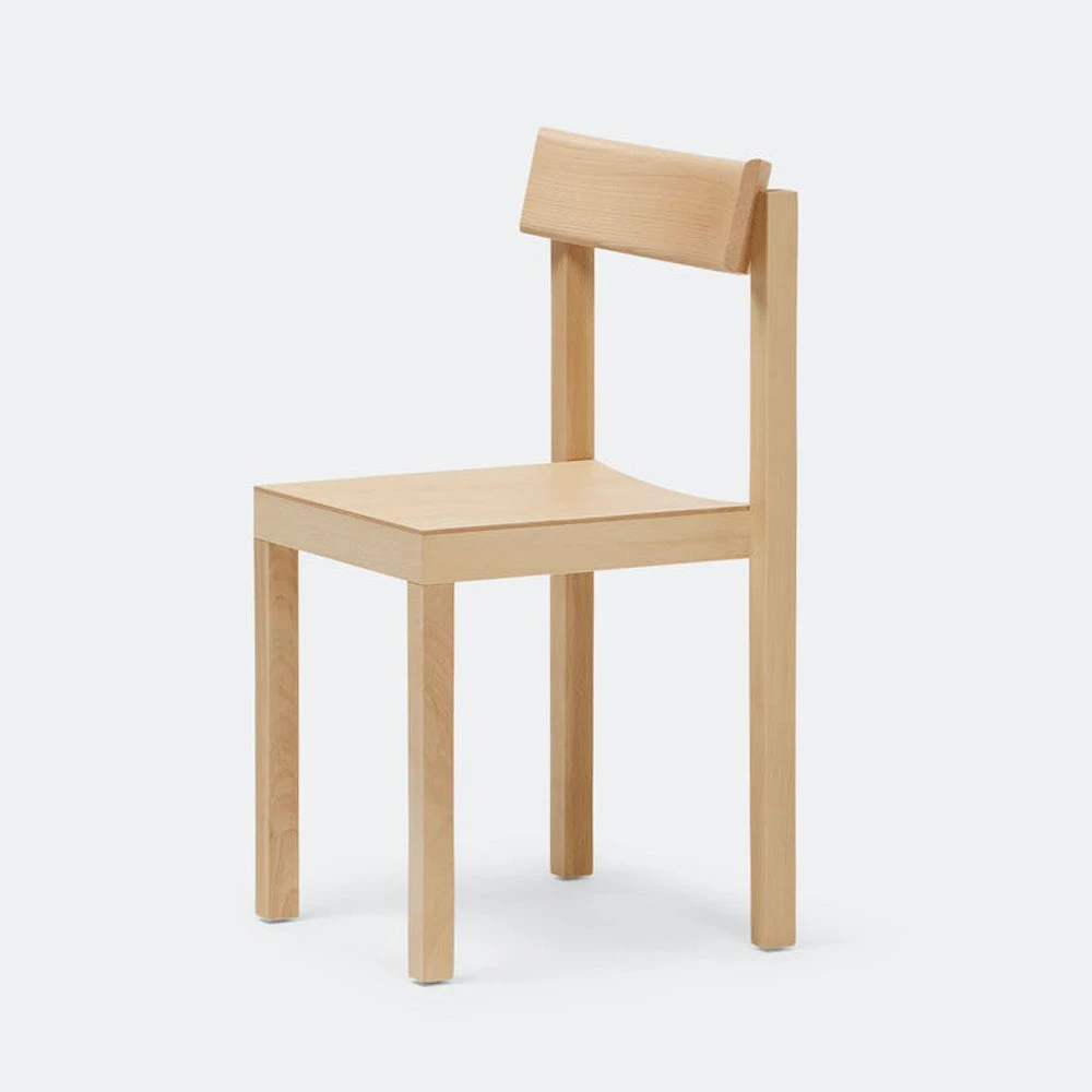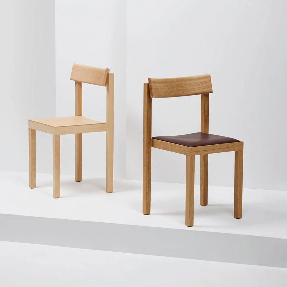 Its design comprises of only the most basic elements —four legs, seat and backrest—. The strictly vertical orientation of its legs gives the chair a strong architectural presence. However, the formal strictness is disrupted by the curved backrest which seems to levitate on the ends of the chair’s hind legs.