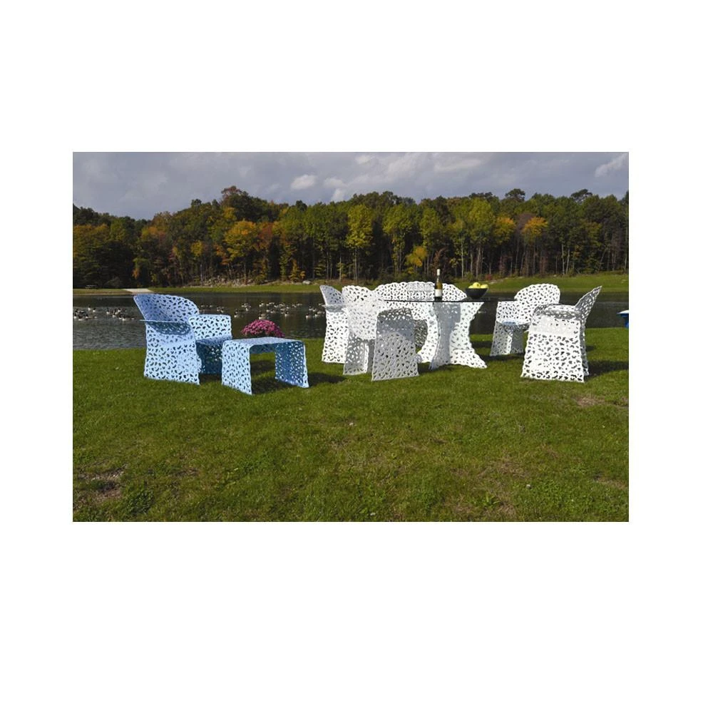 The Collection is made of sheet aluminum that is bent, stamped and folded. All aluminum components are then powder coated, resulting in a piece that you can leave outside throughout the year. Simple, bent components create the sculptural appearance of the Topiary Ottoman/End Table. This versatile piece features a 20″ wide top surface that pairs wonderfully with the