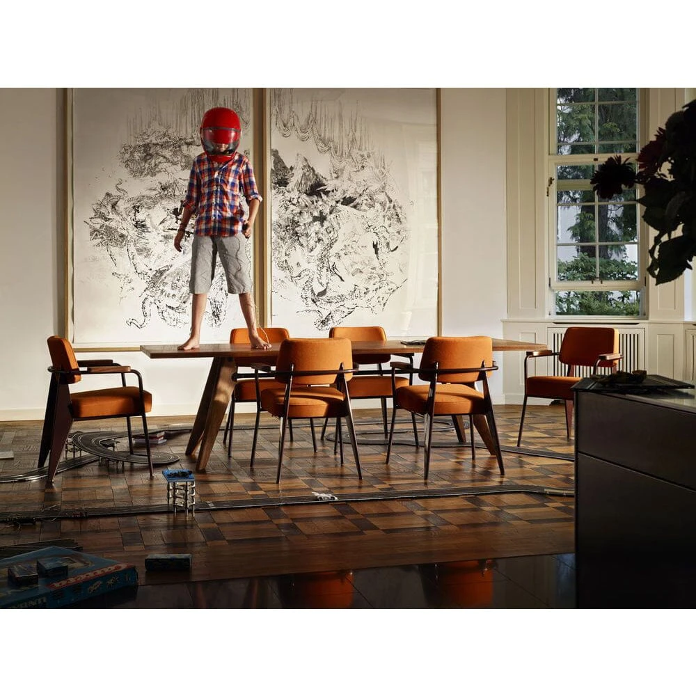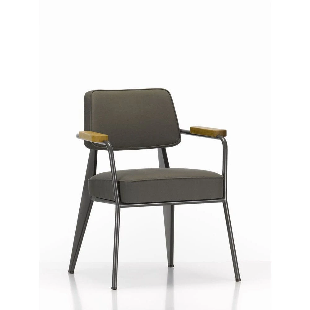 Fauteuil Direction is especially suited for dining room seating or as an armchair in home offices. The design reflects Jean Prouvé’s characteristic aesthetic vocabulary, which is based on structural requirements. The comfortably upholstered armchair is available with fabric or leather covers in a selection of different colours.
