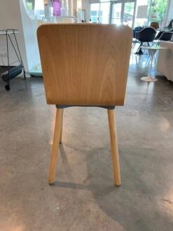- Base: non-stackable wooden base in natural or dark oak. Connecting element between shell and base in die-cast aluminium, powder-coated in dim grey.