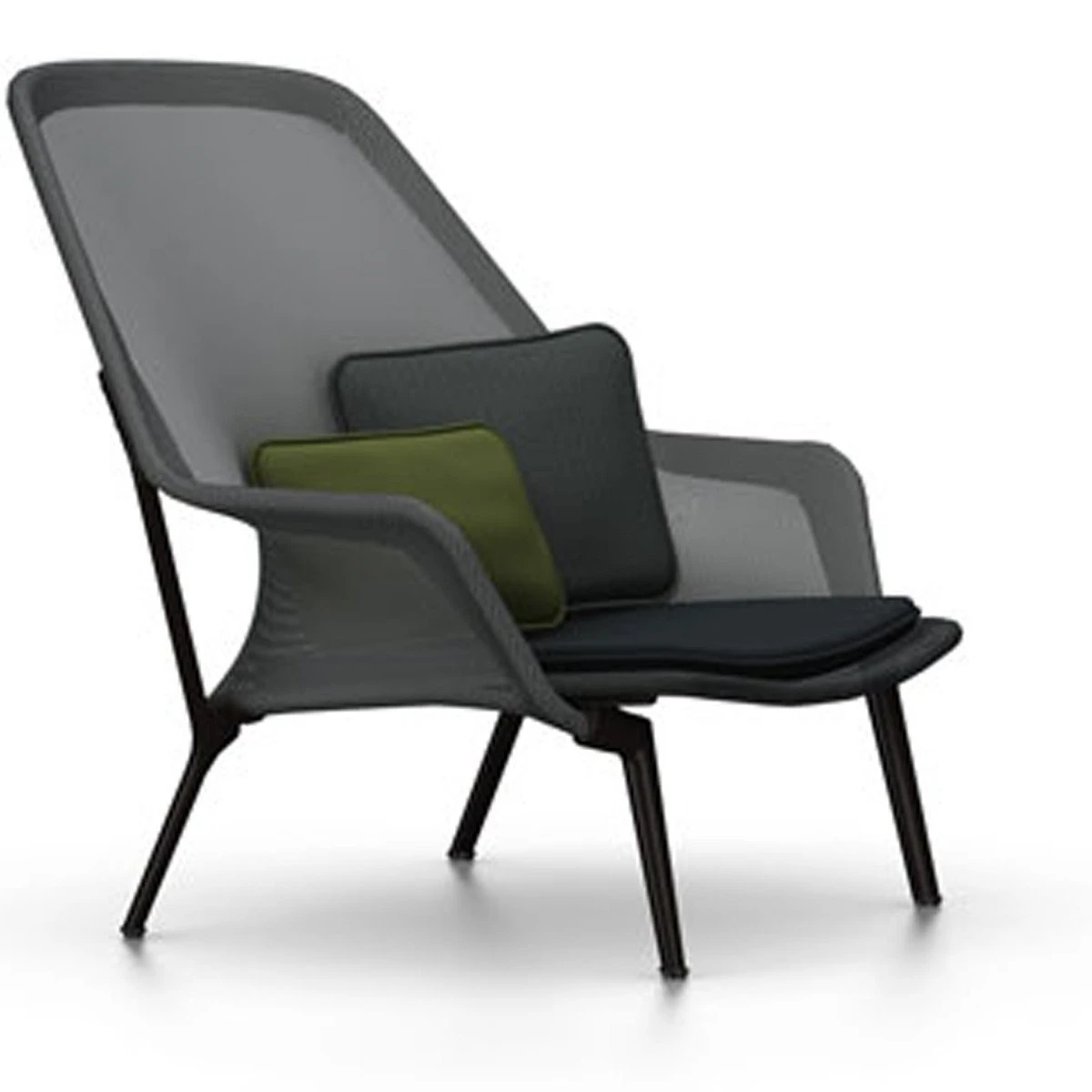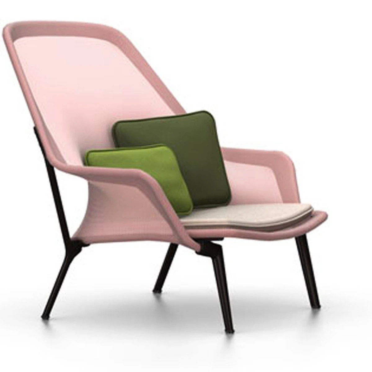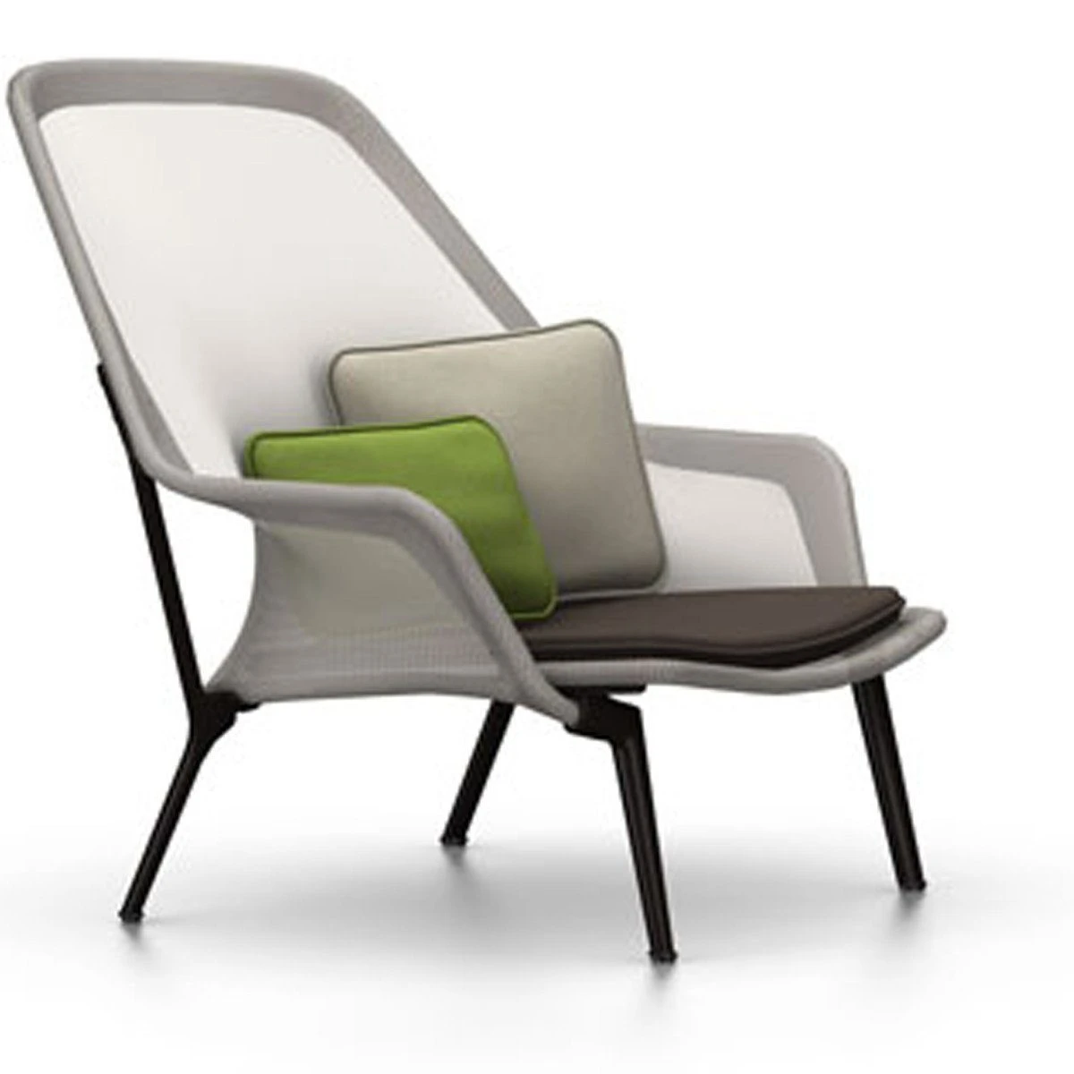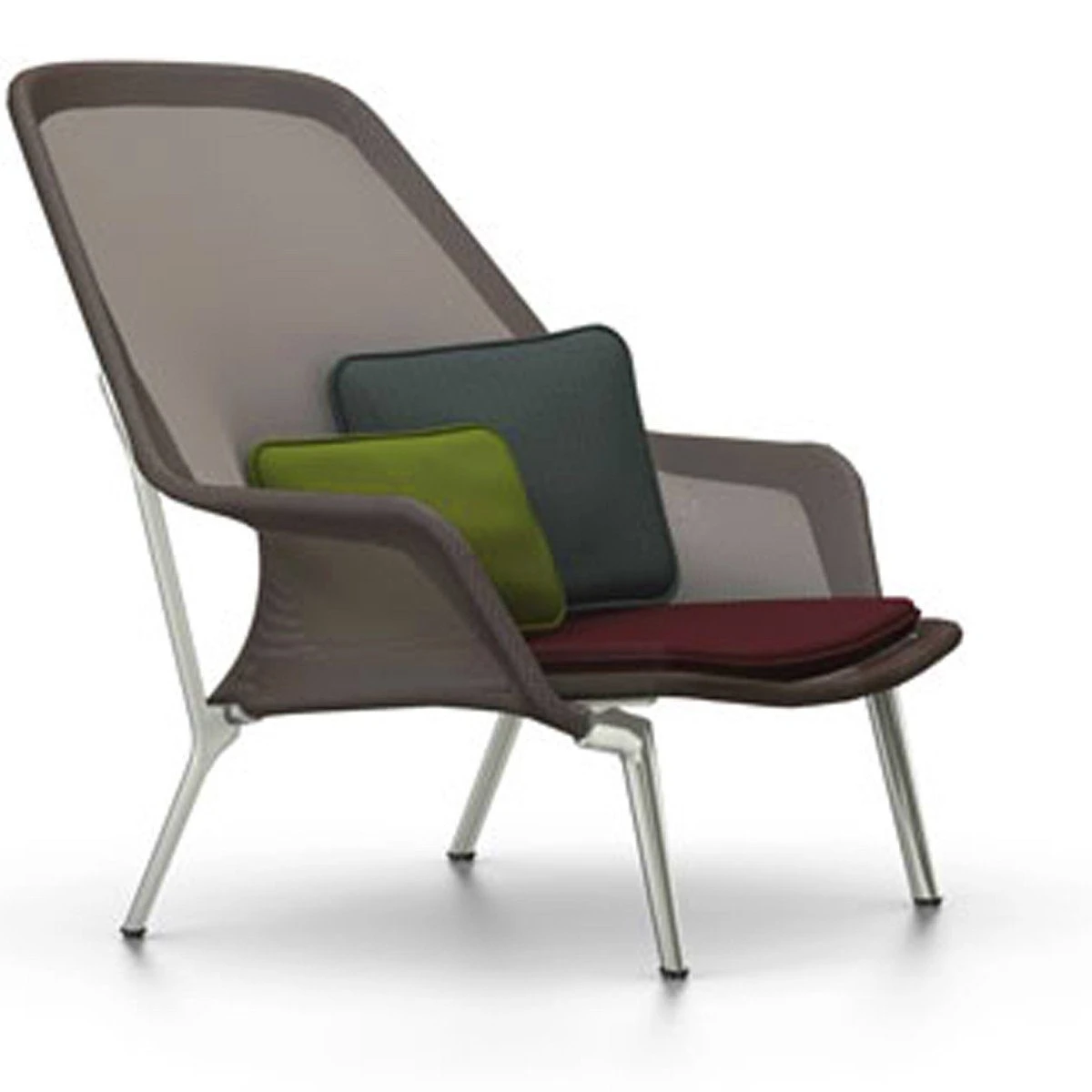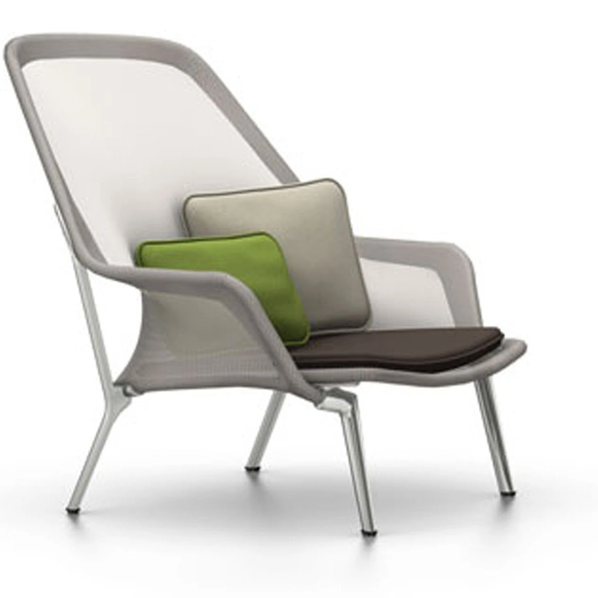 Ronan and Erwan Bouroullec created this expansive armchair by using an extremely strong, precisely shaped knit which is stretched over the metal frame like a fitted stocking. Thanks to the knit sling cover, the Slow Chair combines soft comfort with ergonomic support, which is further enhanced by thin seat and back cushions. The translucent sling cover replaces the thick cushions of traditional armchairs, resulting in a design that is lightweight, yet generously proportioned. The restrained appearance of the Slow Chair is equally appealing in the living room or winter garden, while offering unrestrained seating comfort.